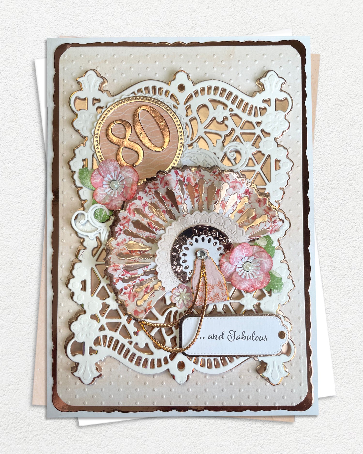 Honour a remarkable 80th birthday with this luxury handmade card, exquisitely designed to be cherished. The card features an ornate fan-inspired motif, accented with shimmering metallic details, layered patterns, and embossed textures that bring depth and elegance. Finished with sparkling embellishments and the heartfelt sentiment, it captures the joy of a life beautifully lived.