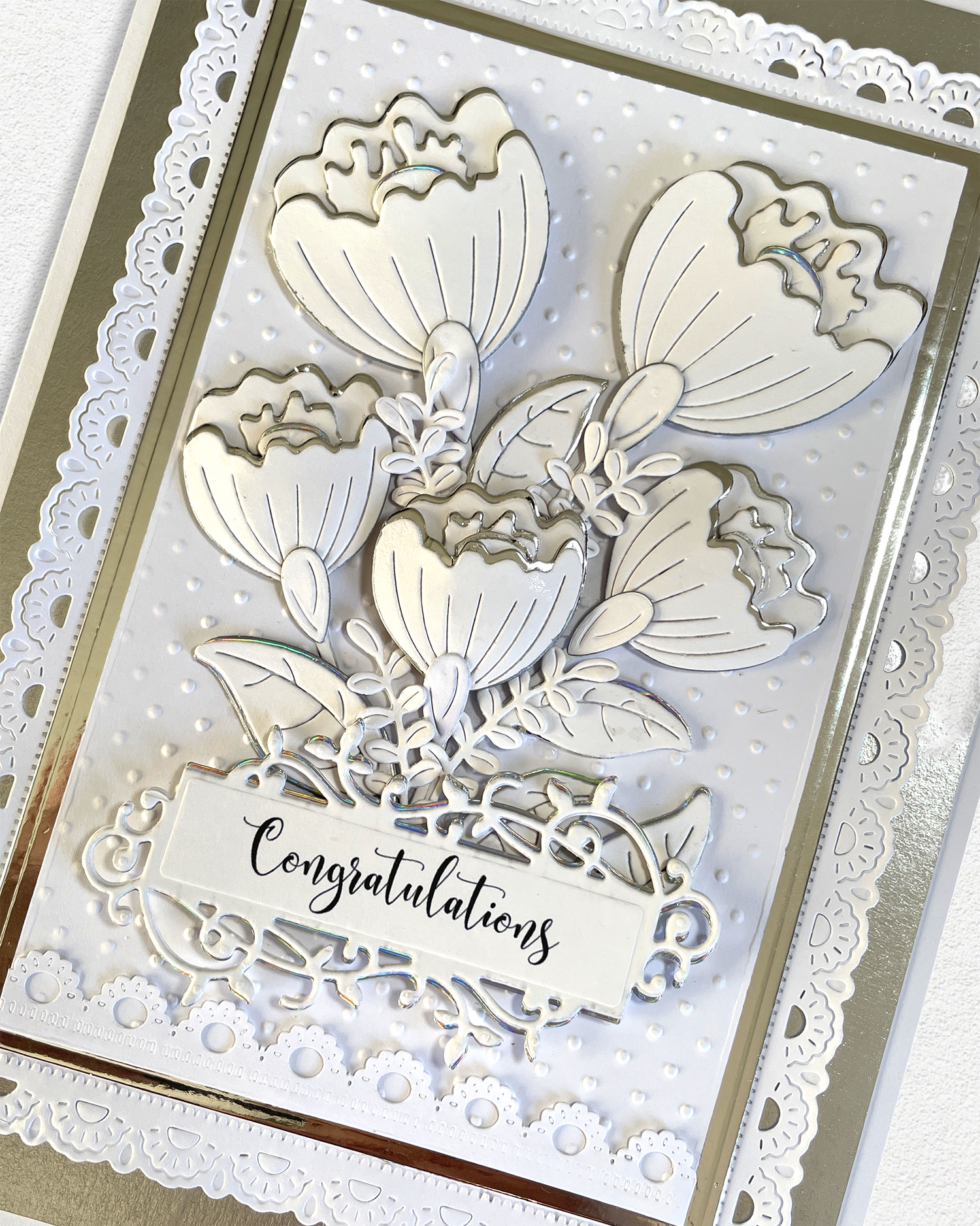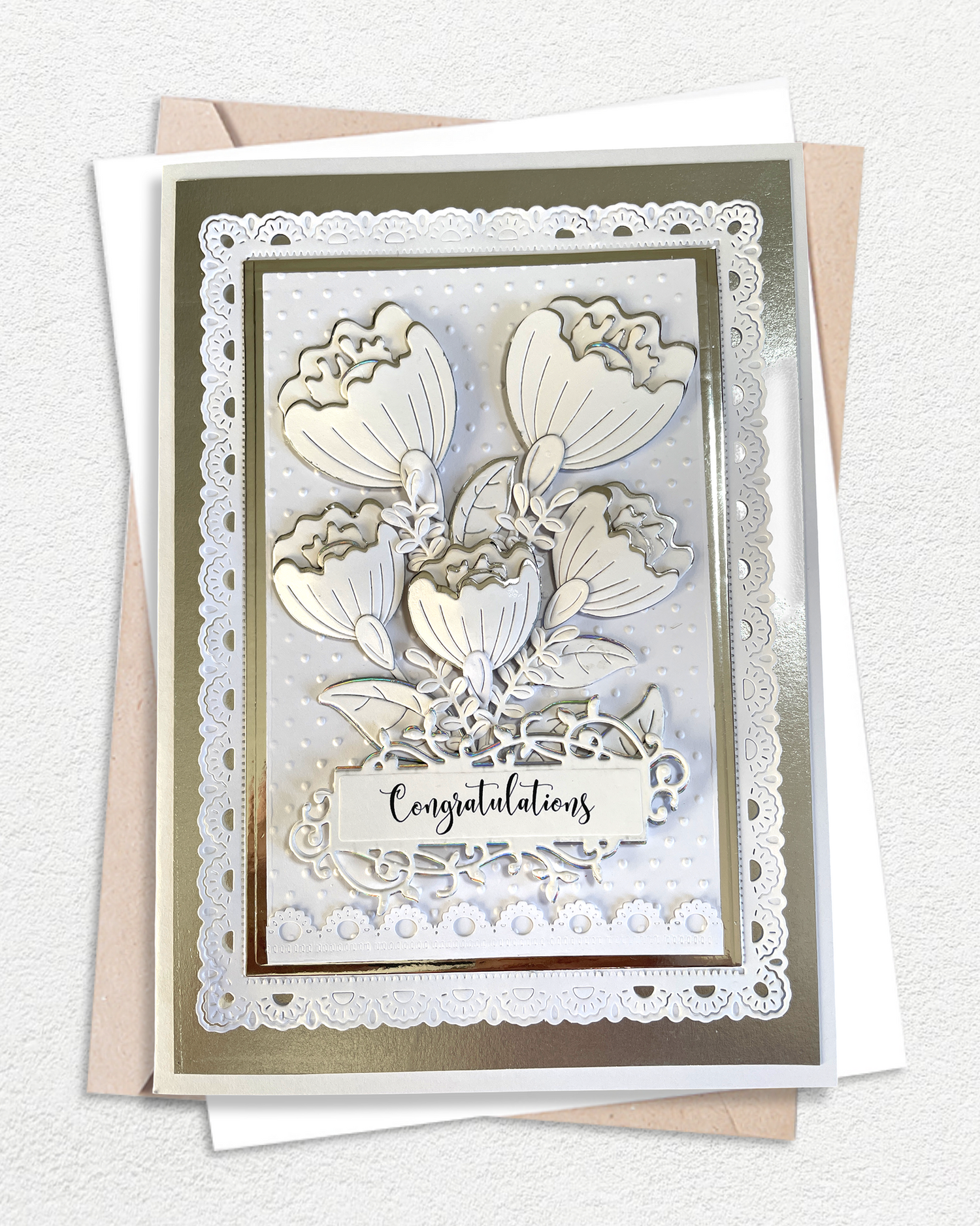 Celebrate life’s special milestones with this luxury handmade Congratulations card, exquisitely designed to be cherished. The card features intricate hand-embossed silver papers foil details, framed with a delicate lace-style border and an elegant dotted emboss background. At its center, layered satin-finish paper flowers create a striking bouquet, highlighted by shimmering metallic accents for a radiant touch.