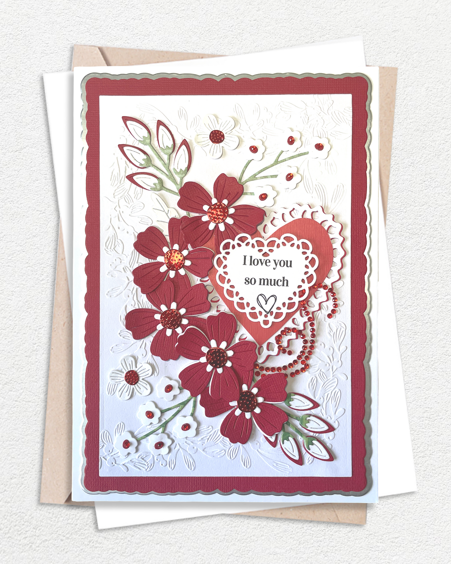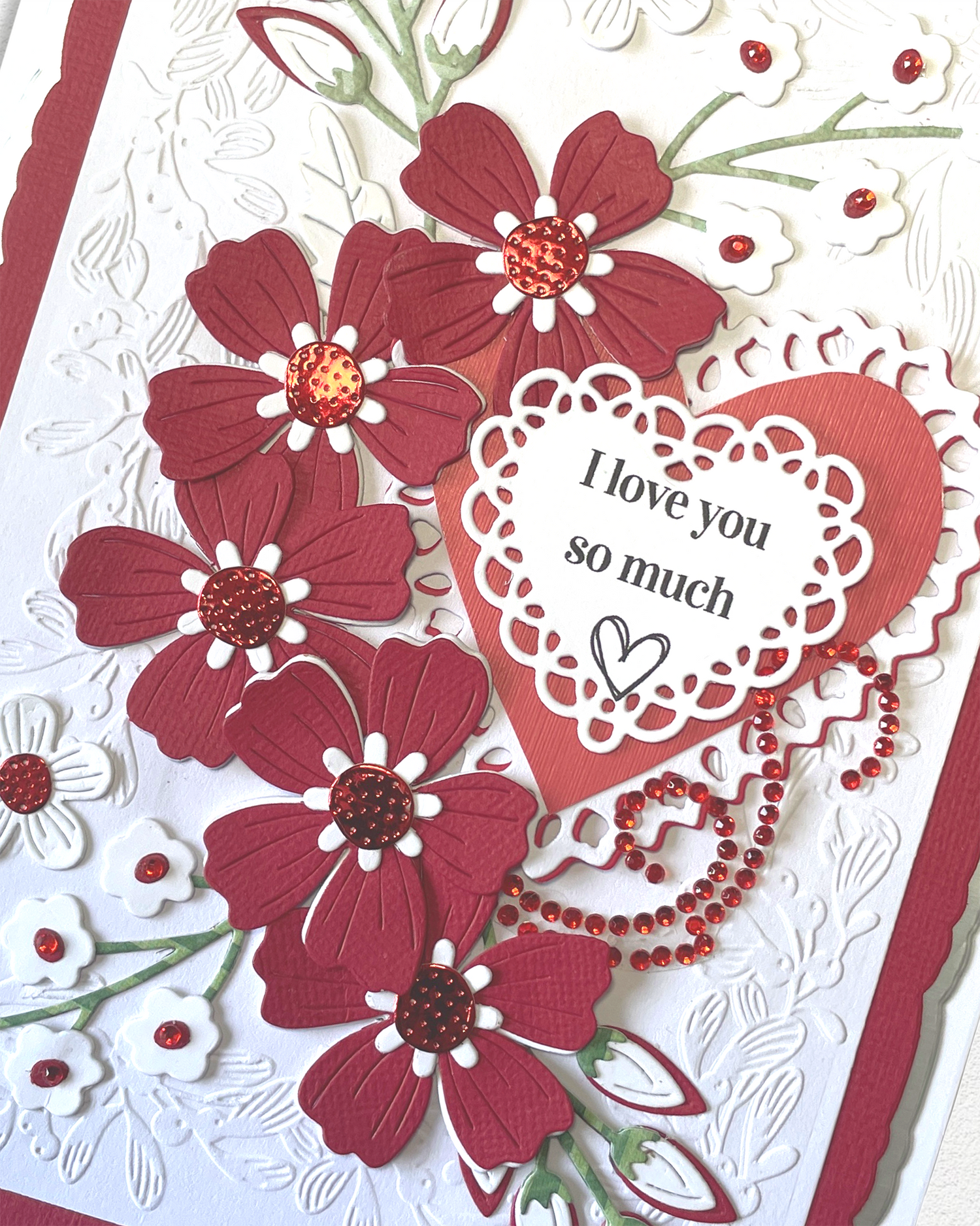 Materials: 300 gsm Cardstock, Acid-free design papers, Vintage elements, Handmade paper flowers, and red mini gems.