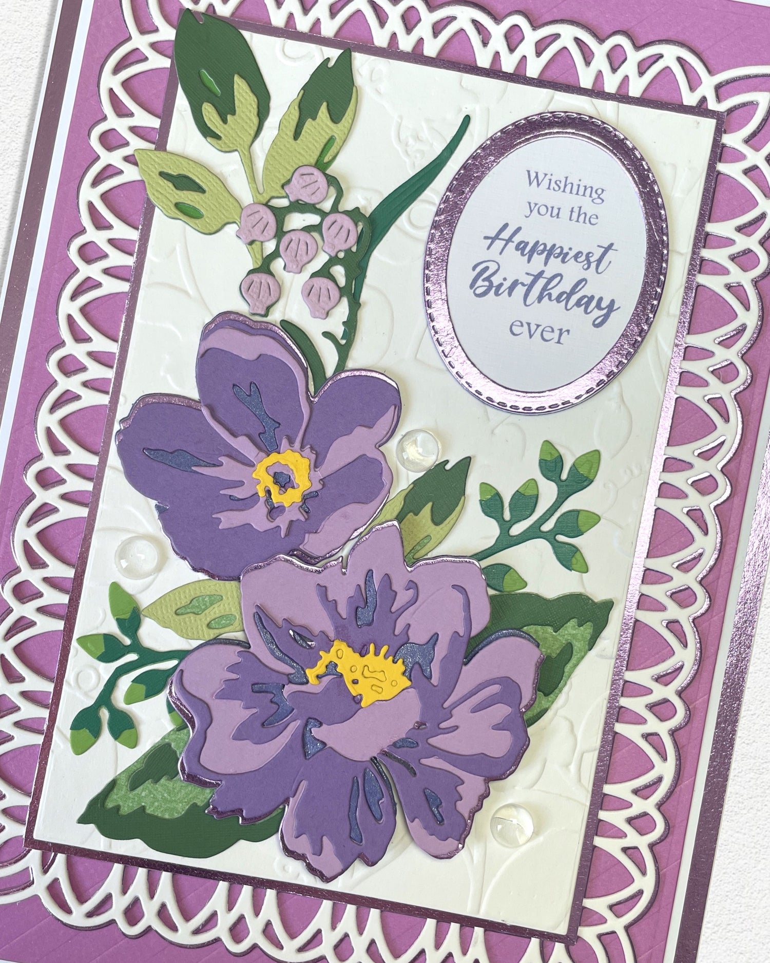 This handmade birthday card features beautifully layered paper flowers set against an embossed backdrop and adorned with delicate raindrop accents. Thoughtfully crafted for someone who deserves the “Best Birthday Ever,” it’s a heartfelt keepsake they’ll love and display.