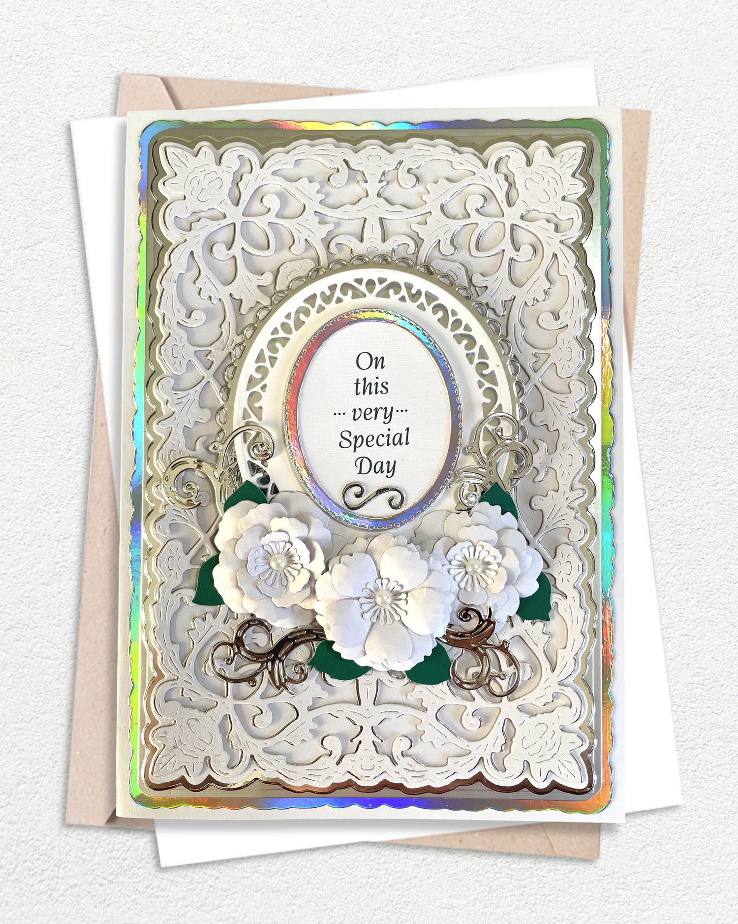 Celebrate life’s most cherished moments with this luxury handmade card, beautifully designed to be treasured. The card features intricate hand-embossed silver and holographic foil patterns with an ornate frame design, creating a radiant, elegant look. Adorned with delicate handmade satin-finish paper flowers, pearl details, and silver foil leaves, this card exudes timeless sophistication.