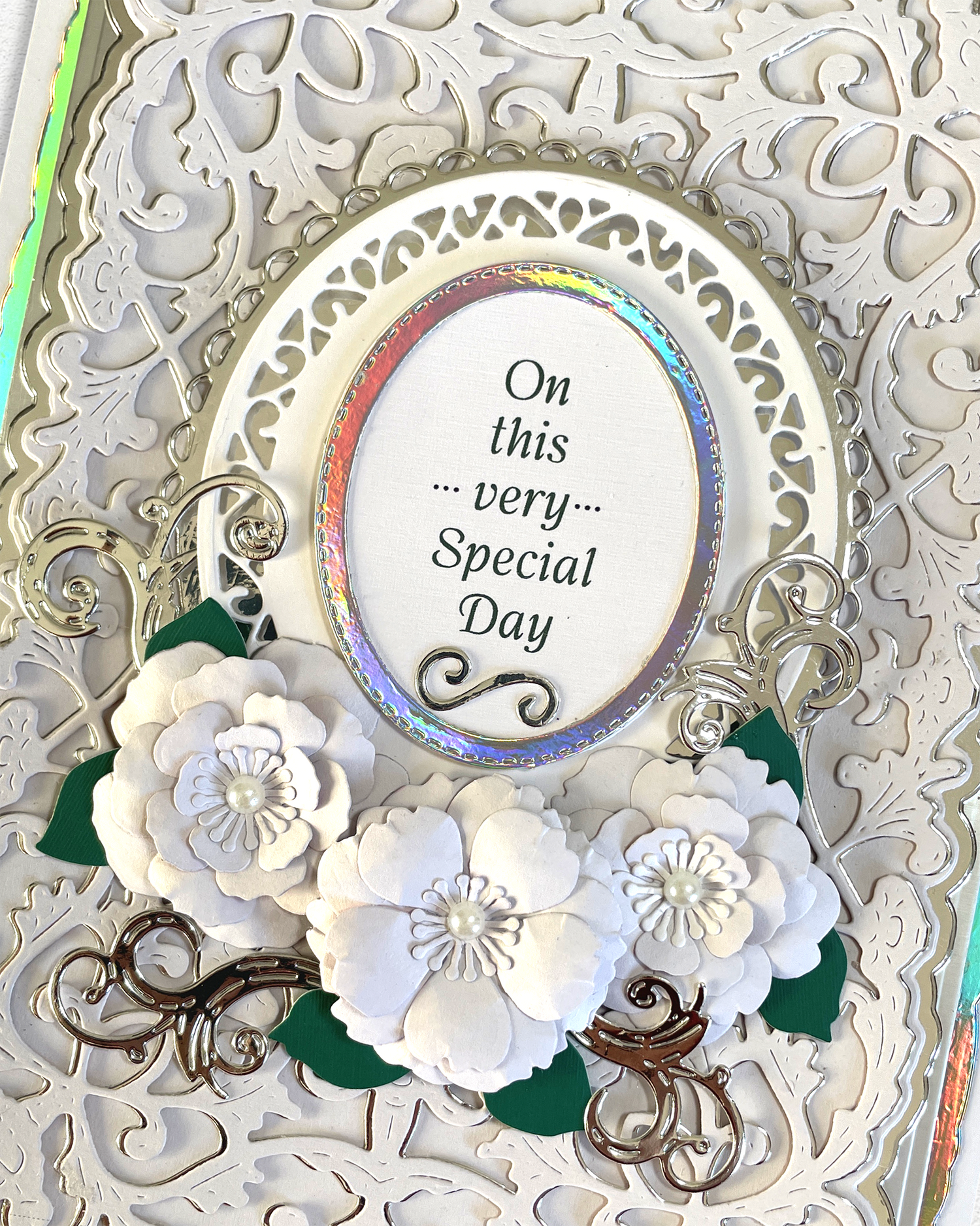 Materials: 350gsm premium thick Cardstock, hand-embossed holographic and silver mirror papers, handmade satin paper flowers with pearl embellishment, metallic leaf details.