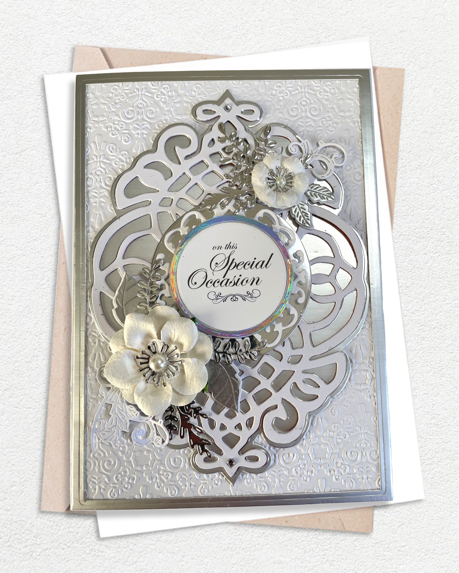 Celebrate life’s most cherished moments with this luxury handmade card, beautifully designed to be treasured. The card features intricate hand-embossed silver and holographic foil patterns with an ornate frame design, creating a radiant, elegant look. Adorned with delicate handmade satin-finish paper flowers, pearl details, and silver foil leaves, this card exudes timeless sophistication.