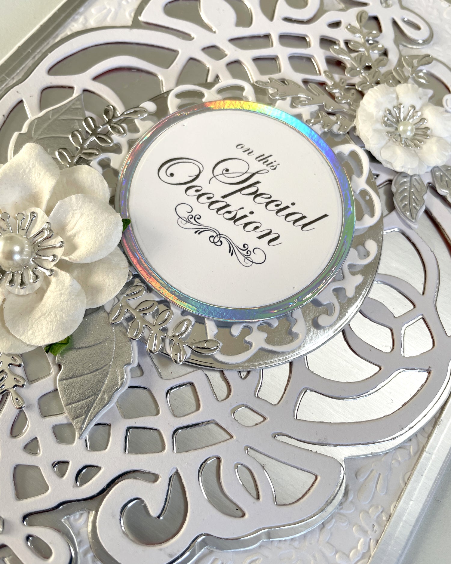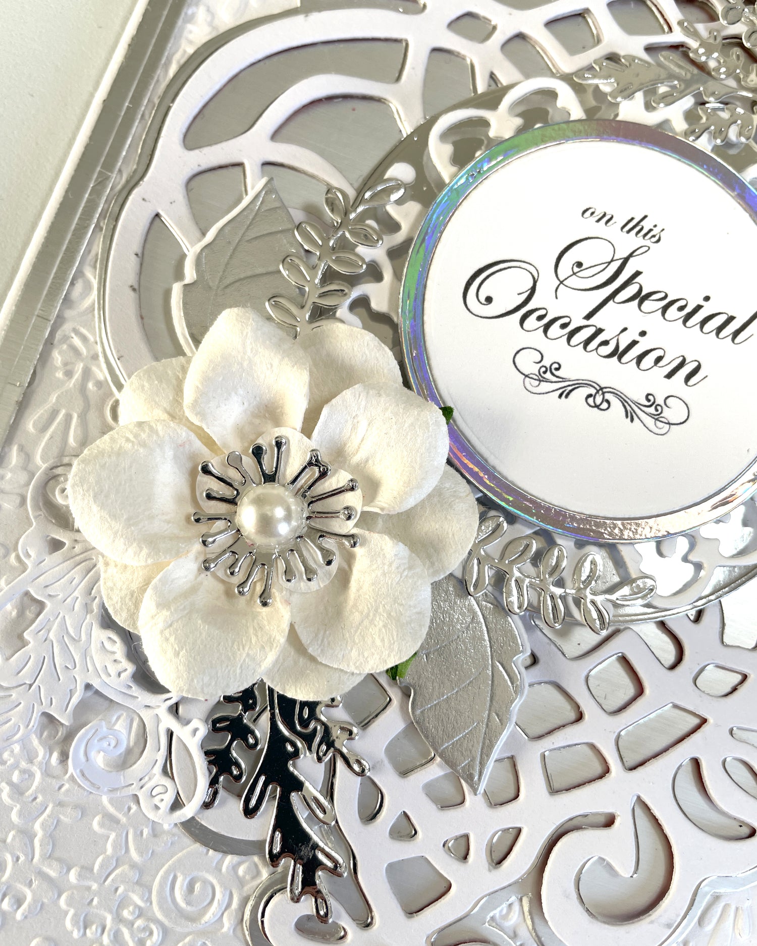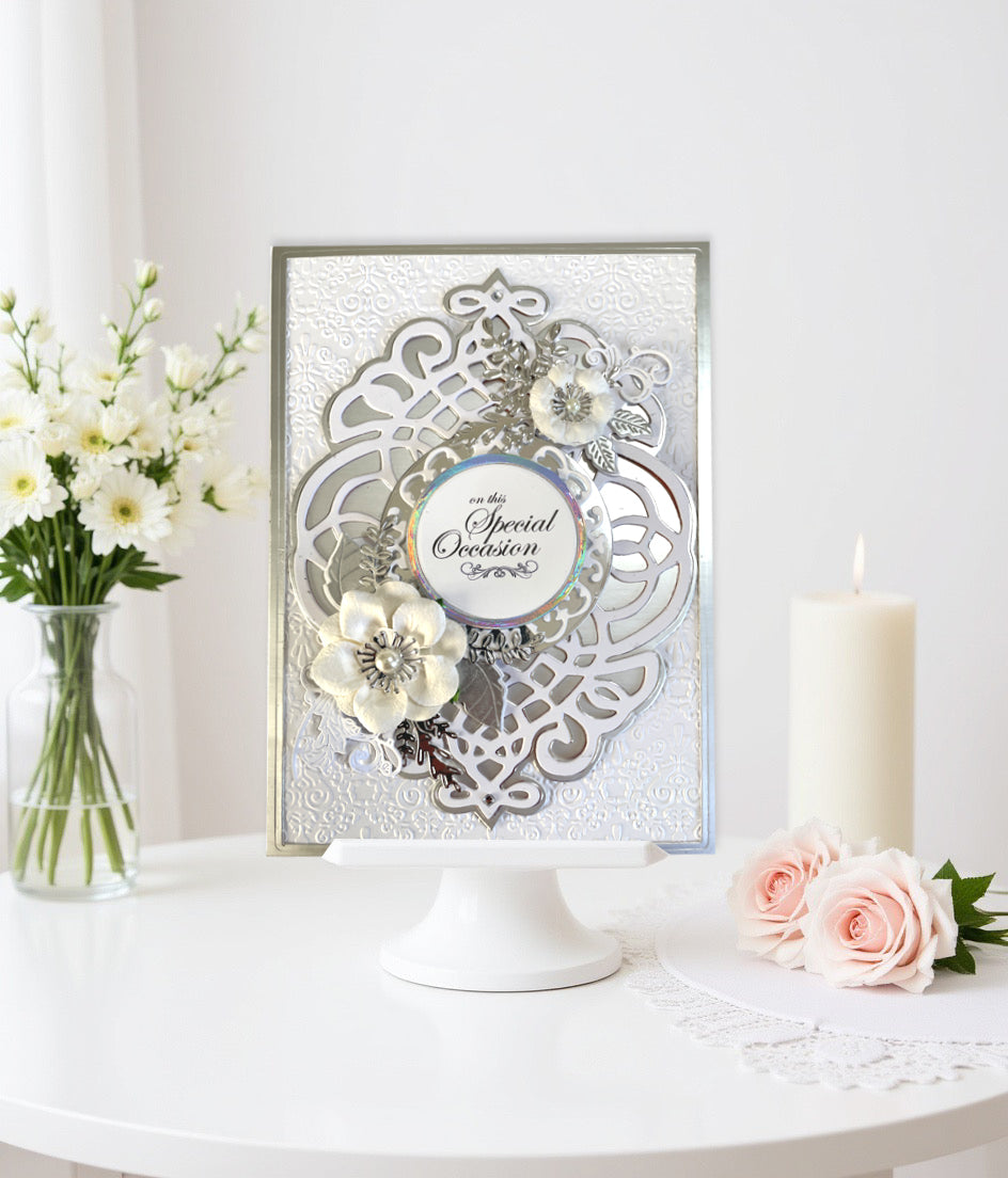 Materials: 350gsm premium thick Cardstock, hand-embossed holographic and silver mirror papers, handmade satin paper flowers with pearl embellishment, metallic leaf details.