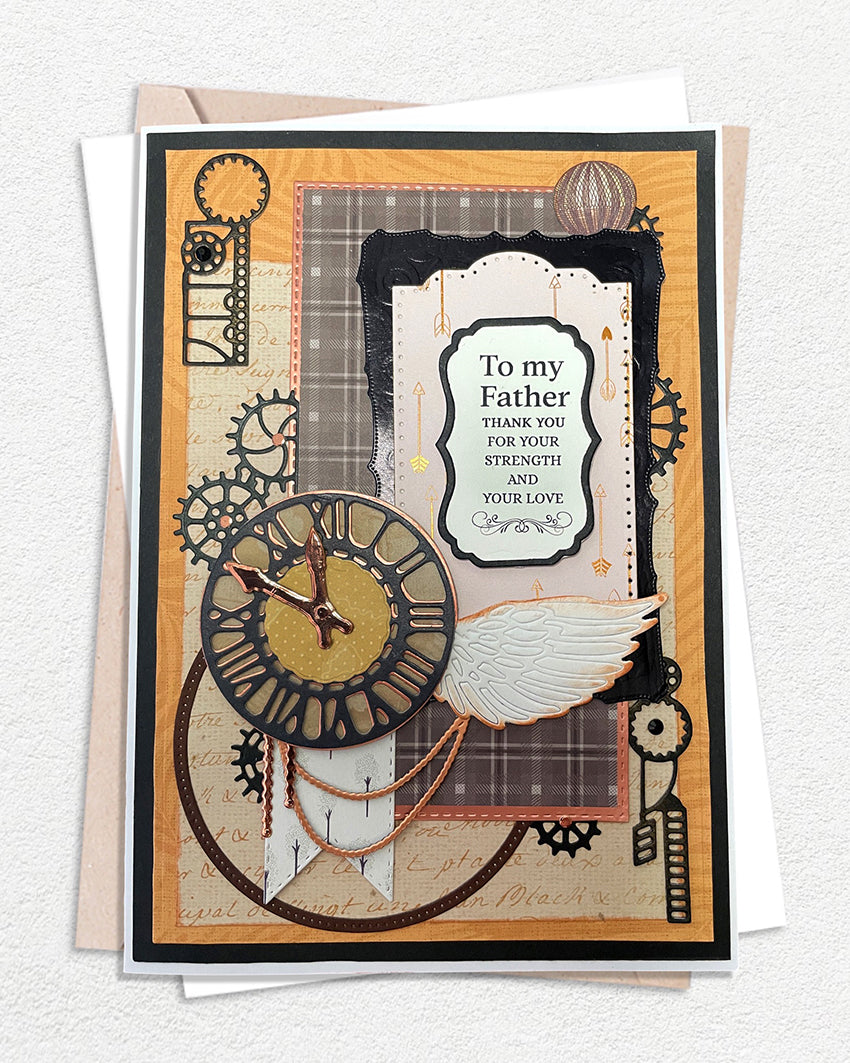 Celebrate a father’s strength, wisdom, and guidance with this luxury handmade steampunk-themed greeting card. Perfect for birthdays, or a heartfelt moment of appreciation, this unique card is designed to be treasured for years to come.