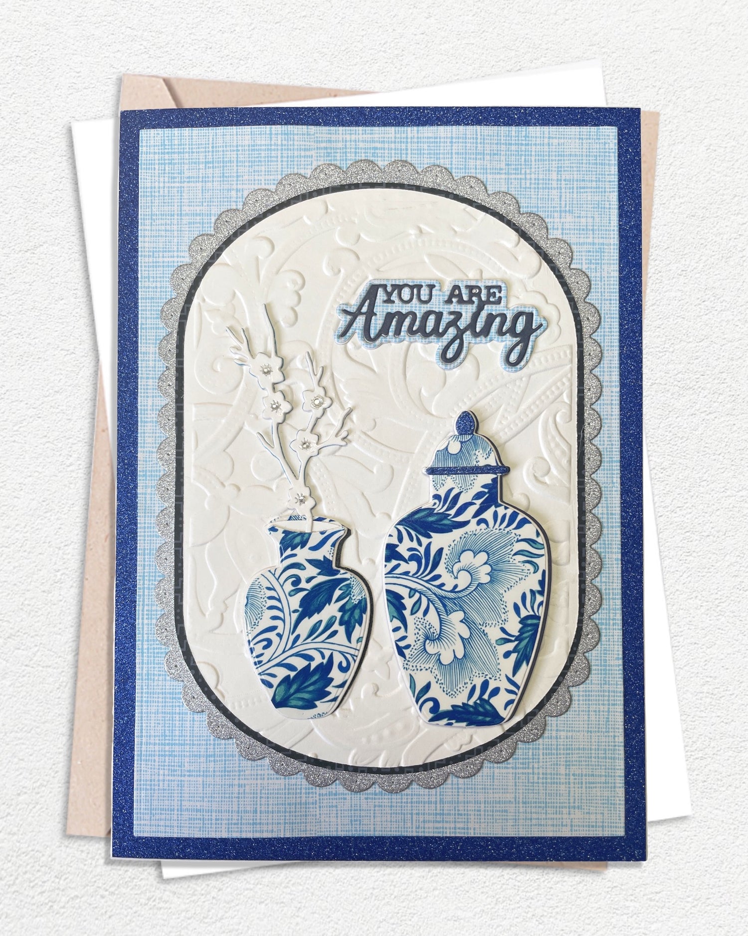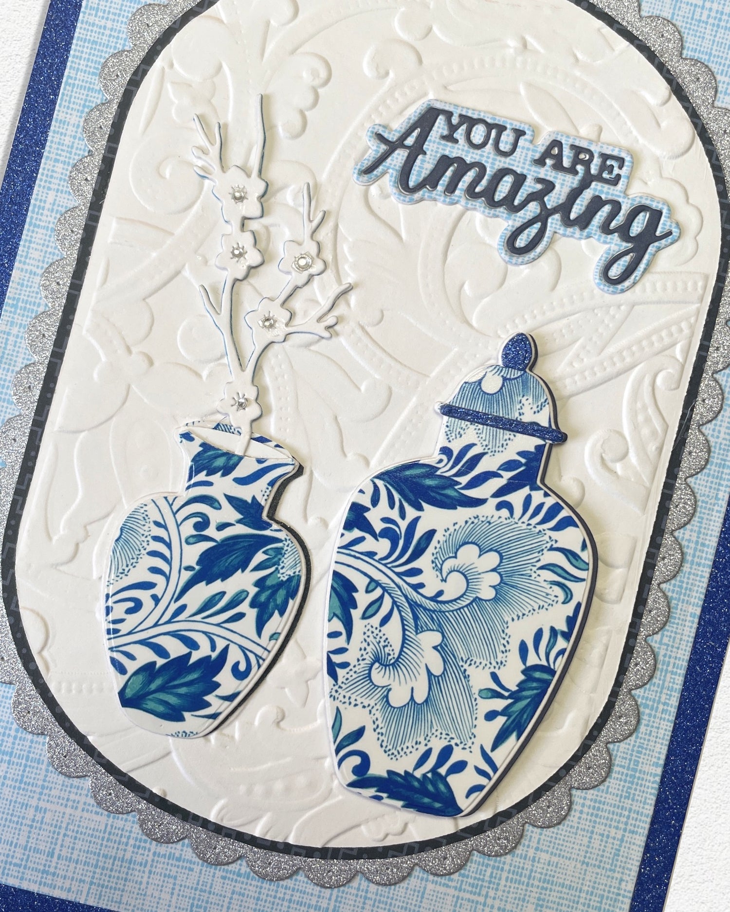 Materials: 300 gsm Cardstock, Hand-embossed Premium Cardstock, Handmade embellishments paper.